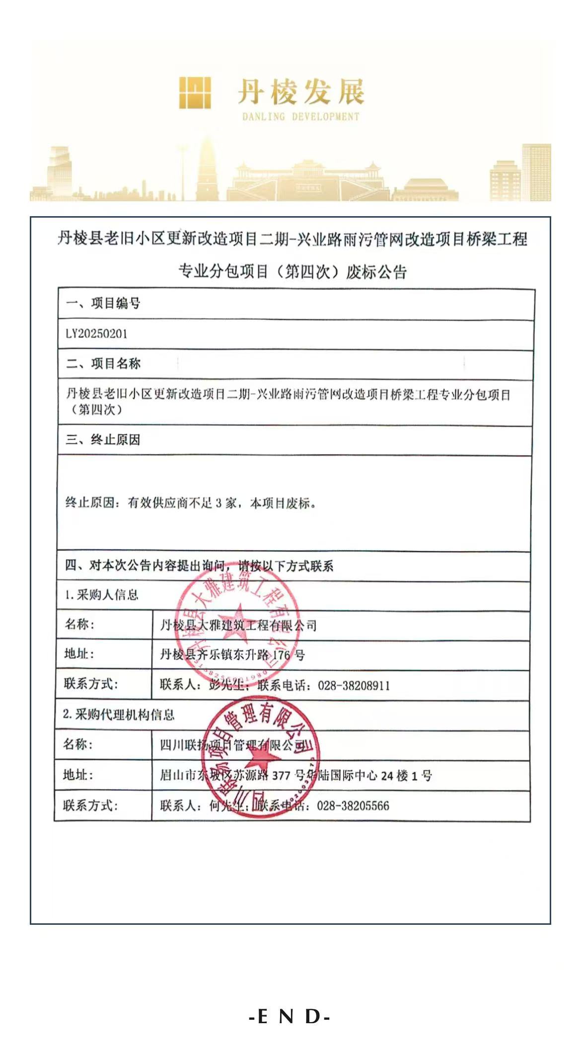 丹棱縣老舊小區(qū)更新改造項目二期-興業(yè)路雨污管網(wǎng)改造項目橋梁工程專業(yè)分包項目(第四次)廢標公告